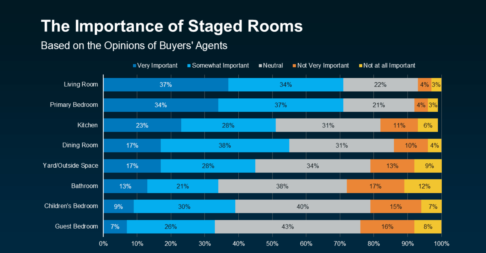 According to the National Association of Realtors (NAR), buyers’ agents say certain rooms carry the most weight when it comes to staging—and focusing on those key spaces can make a big difference (see graph below):
